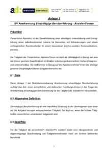 (2) Für die Tätigkeit als persönliche*r Assistent*in existiert weder eine übergeordnete und allgemeingültige Beschreibung von Tätigkeitsmerkmalen noch ein konkret definiertes Berufsbild. Aufgrund dessen wird in einer Anlage 1 dieser Vereinbarung niedergelegt, welche Tätigkeiten als einschlägige Berufserfahrung für die Arbeit in der Assistenz Anerkennung finden sollen.