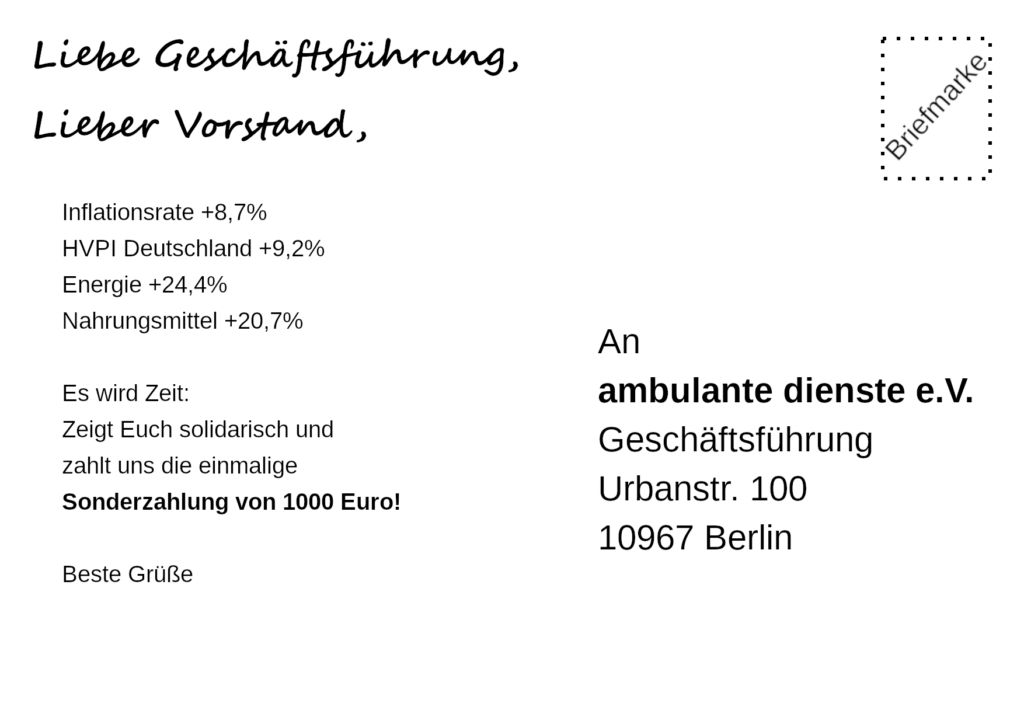 Wir haben dieser Einladung eine Postkarte beigefügt, die ihr bitte unterschrieben der Geschäftsführung von ambulante dienste e.V. zukommen lasst. Damit fordert ihr die Geschäftsführung auf, jetzt sofort aus ihren in kurzer Zeit aufgebauten Rücklagen einen Inflationsausgleich zu zahlen. Der Betrieb kann sich das leisten.Also schickt die Karte per Post an die Leitung von ambulante dienste e.V. in der Urbanstr. 100 oder schmeißt sie dort persönlich in den Briefkasten. Ansonsten könnt ihr die Karte auch an den Betriebsrat mailen oder ihr fragt eure EBs bzw. in den Einsatzbüros, ob sie Eure Postkarte weiterleiten können.